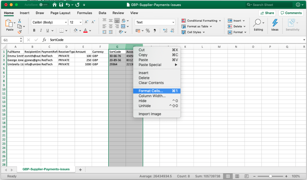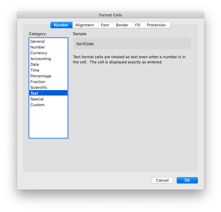- Once the cells are formatted as text, you will be able to update the sort code and account numbers without Excel reformatting the data.